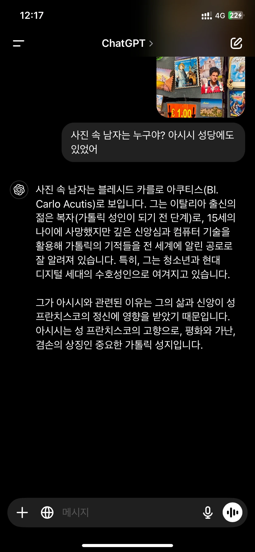 산타 루피노 성당에는 한 남자의 사진이 전시되어 있고 그를 향한 촛불들이 켜져 있다. 그리고 관광 스팟을 돌아다닐 때마다 심심치 않게 볼 수 있는 그는 관광상품에서도 모습을 드러낸다. 복장으로 봐서는 꽤나 최근의 인물인 것 같아 혼자 궁금해하다가 챗gpt에게 물어보았다.