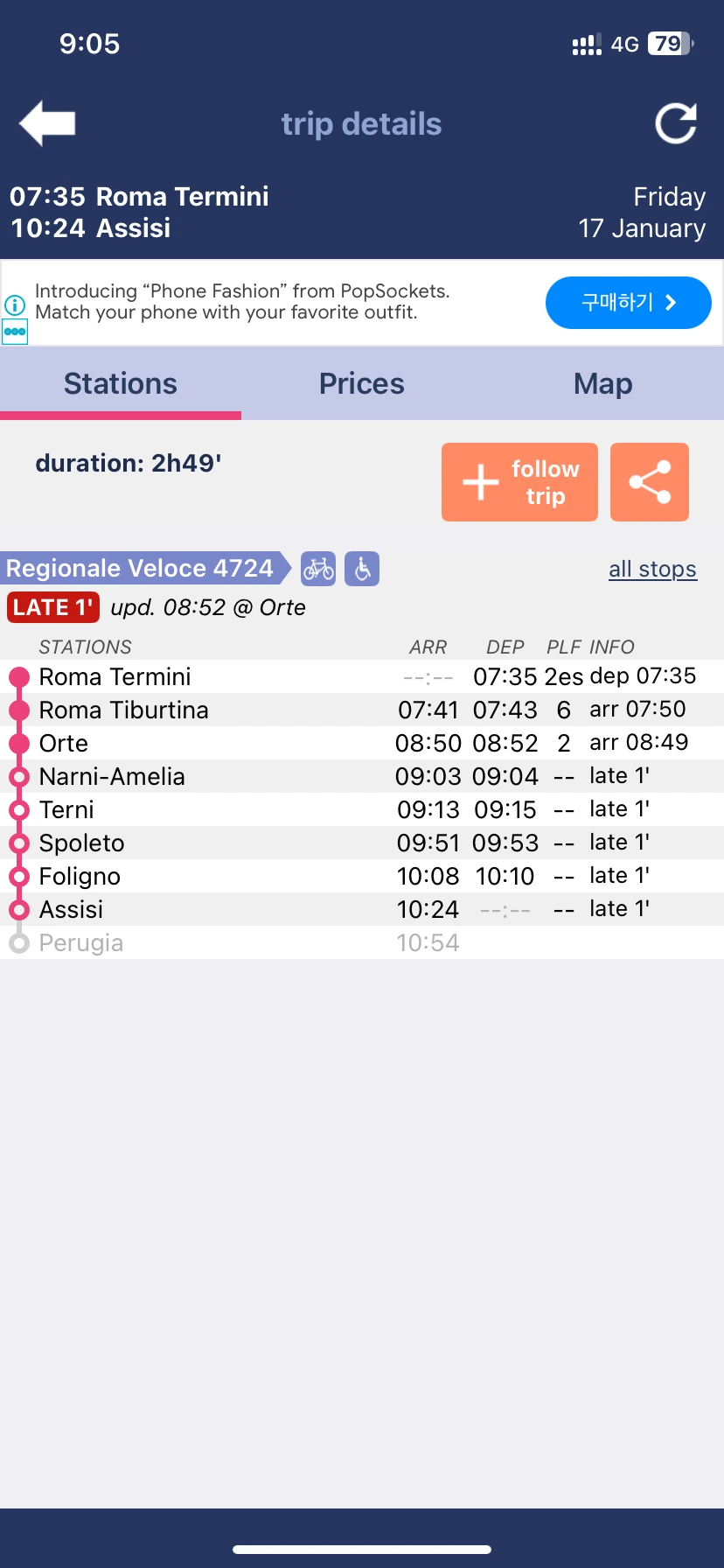 당일치기 여행객인 나는 오전에 출발해야 했으므로 7시 35분 출발하는 기차를 탔다. 환승까지 고려한다면 아침에 잠을 좀 더 잘 수 있었겠지만, 이동시간의 변수가 더 발생할 확률이 높은 건 굳이 선택하고 싶지 않았다. 보통 2시간 30분이면 도착하는데, 난 갈 때는 2시간 49분, 올 때는 3시간이 걸렸다.(다시 한번 말하지만 여기는 로마 근교가 아니다. ^-^;;) 마지막 사진은 트랜잇 어플의 캡처 화면이다. Tranit은 기차 시간을 확인하는 데 매우 유용하다. 빨간색 표시를 보면 알겠지만, 1분이라도 연착되면 저렇게 표시된다. 돌아오는 차편은 상황을 봐서 나중에 살 것. 난 예상보다 빨리 내려와 4시 27분 차를 타고 돌아왔다.