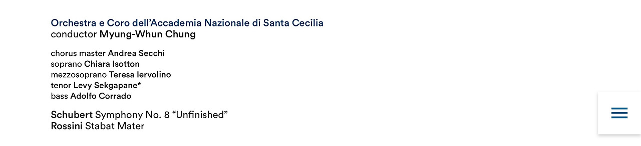 먼저 1월 9일과 11, 12일에는 베토벤 교향곡 7번과 Sergey Khachatryan과 함께 하는 브람스 바이올린 콘체르토이고, 1월 16~18일에는 슈베르트 미완성 교향곡과 로시니 Stabat Mater이다. 앞선 공연의 곡들을 더 잘 알고 좋아하기도 했지만, 이미 좋은 자리들은 다 나간 상태이고 피렌체 여행 일정과도 부딪쳐 아쉽지만 슈베르트와 로시니의 음악을 듣게 되었다.(그때부터 내 여행의 bgm은 저 두 작품이 되었다.) 54.86유로. 한국과 비교하면 거의 절반의 금액으로 아름다운 공연장에서 음악을 즐길 수 있다니 행운이다. 여담이지만, 정명훈 지휘자는 이 공연장과 연이 깊은 모양이다. 이번 공연이 이뤄지는 산타 체칠리아 홀이 2002년에 오픈했는데, 그때도 지휘를 맡았다고 한다.