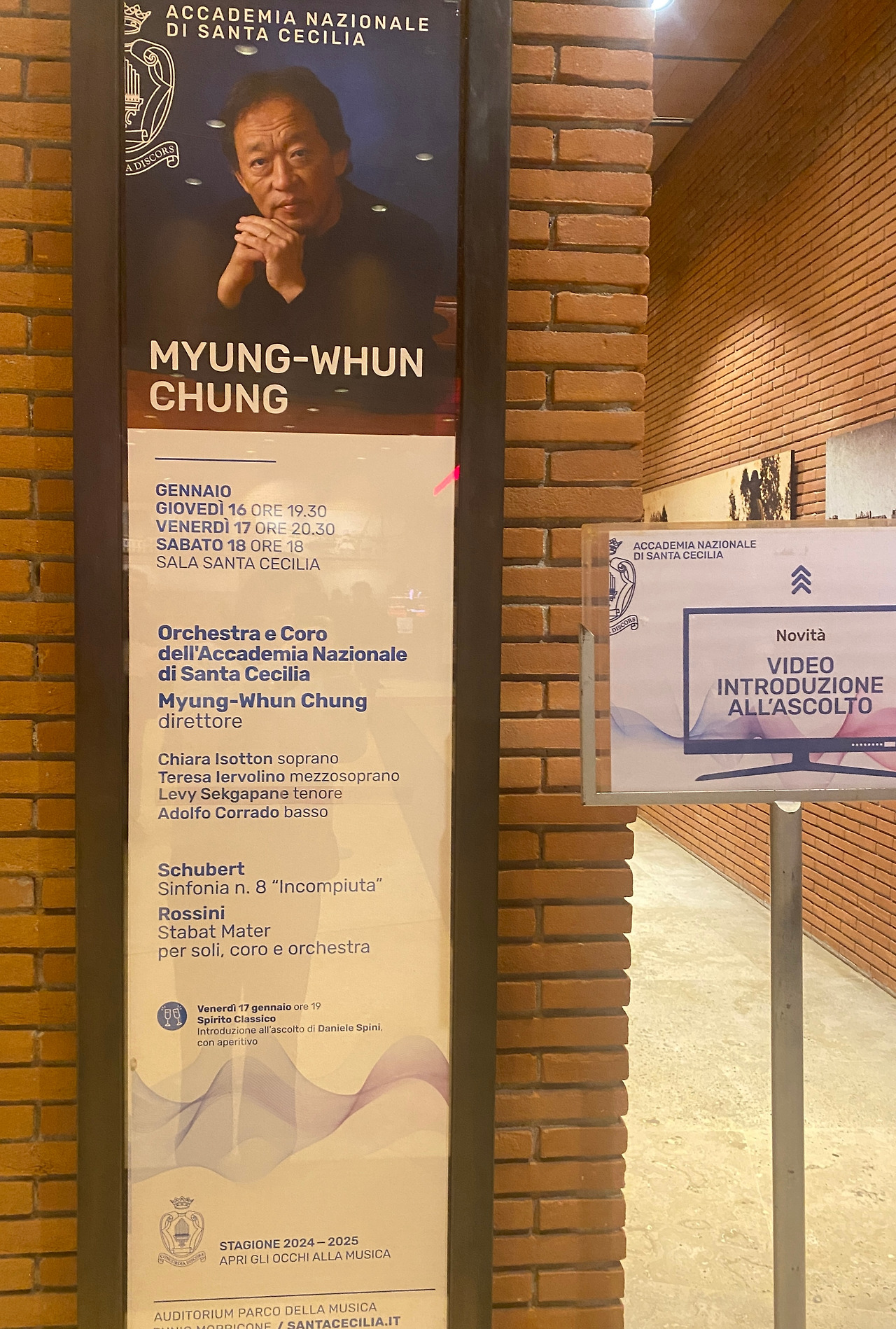 그래서 이번 여행에서는 음악 공연과는 연이 없나 보다 싶었는데, 가이드북을 뒤적이다가 보르게세 공원 위쪽에 아름다운 공연장이 있다는 사실을 알게 되었다. 파르코 델라 뮤지카 오디토리움(Auditorium Parco della Musica Ennio Morricone). 유명 건축가 렌조 피아노가 2002년 세운 음악홀로 유럽에서 가장 큰 다기능 음악 복합 건물이라는 설명도 덧붙어 있다. 홈페이지를 찾아 들어가 2025년 1월 공연 리스트를 검색하는데, 익숙한 이름이 눈에 띈다. 지휘자 정명훈.
