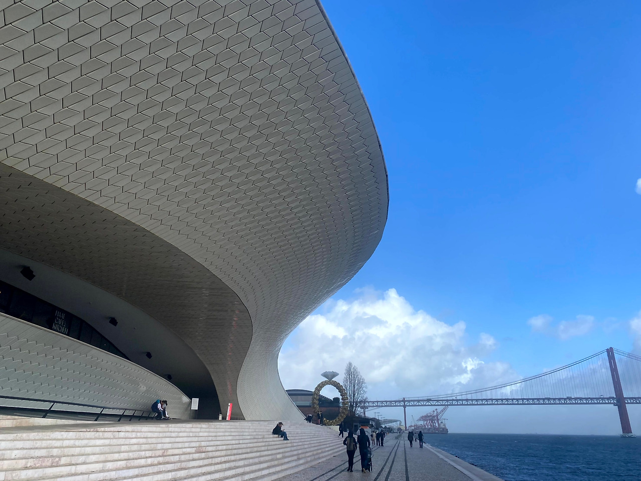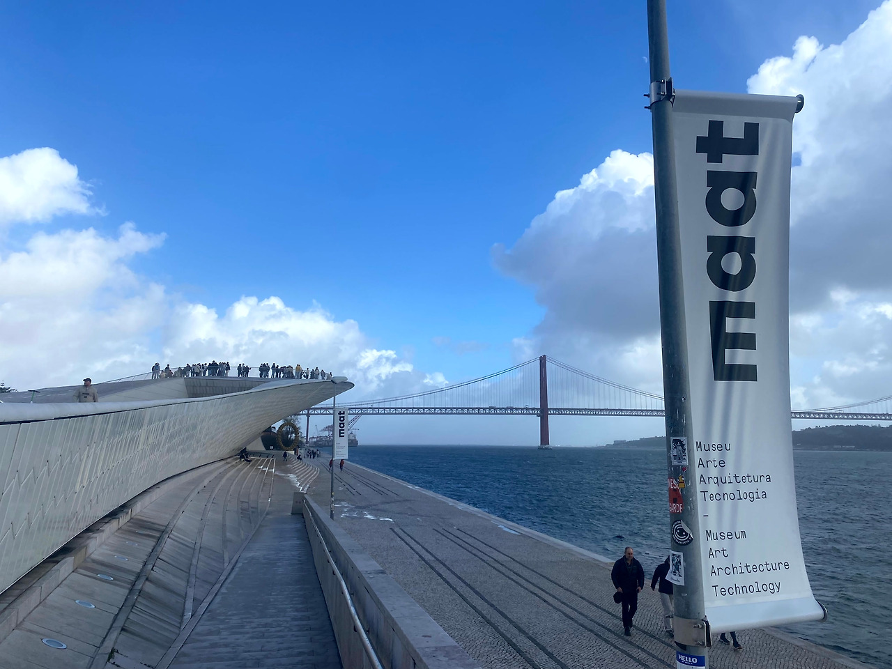 4월 25일 다리와 테주 강의 탁 트인 풍경을 보고 싶다면 예술 건축 기술 박물관(MAAT)을 방문해 보자. 벨렝지구 쪽으로 이동하는 길에 위치한다. 실험적인 작품들이 있는 내부 전시도 볼만 하지만, 이곳은 무엇보다 독특한 디자인의 외관이 인상적이다. UFO같기도 하고 선장의 모자 같기도 한 박물관 지붕으로 올라서면 답답했던 속이 뻥 뚫린다. 바람이 세차게 부는 날이면 이것(?)을 타고 항해를 떠나는 착각까지 하게 될지도 모른다. 리스본의 새로운 랜드마크로 떠오르고 있는 이곳의 석양 역시 아름답다고 하니 참고하시길.