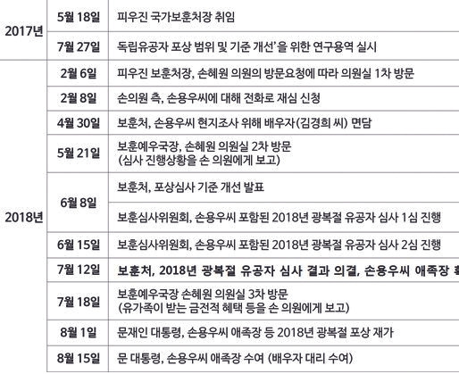 (1) 2018년 2월 6일 손혜원은 피우진 보훈처장에게 방문을 요청한다. 이에 피우진과 독립유공자 서훈 업무를 총괄하는 임성현 당시 보훈처 보훈예우국장이 함께 손혜원 의원실을 방문했다.