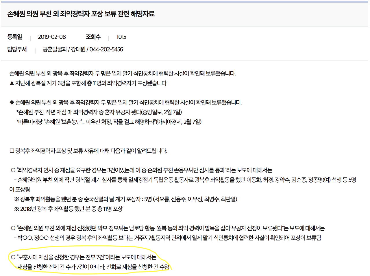 본 내용은 올해 2월에 국가보훈처가 손혜원 부친 논란에 대해 해명하는 글을 올린 것이다.