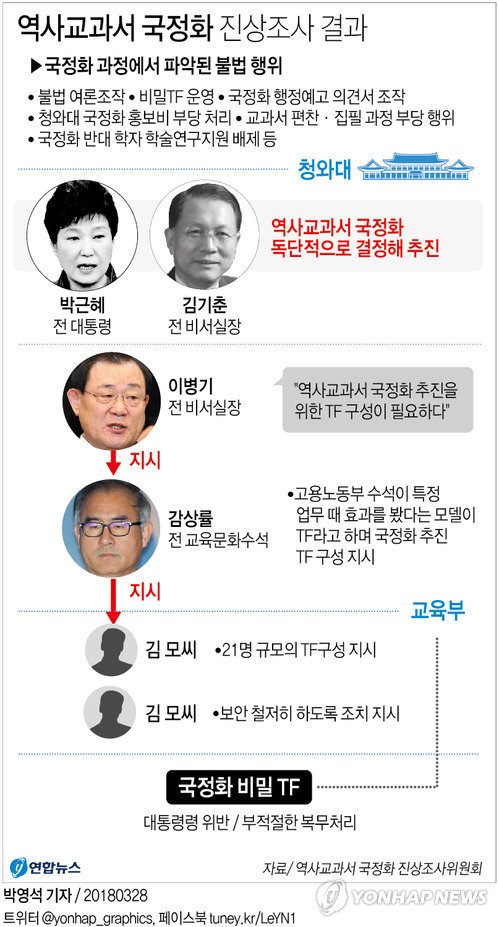 이에 따라 진상조사위원회가 꾸려졌으며, 검찰의 수사가 시작됐다. '적폐, 국정농단 대상'은 17명으로 청와대 5명, 교육부 8명, 민간인 4명이었으며 이 중 이병기 전 청와대 비서실장과 김상률 전 청와대 교육문화수석, 김관복 전 청와대 교육문화수석실 비서관 등 핵심 고위 직군들이 포함되어 있었다. 박근혜 정부가 만들어낸 '국정교과서' 관련 불법 행위들과 이번 사건은 그 형태가 다를 뿐이지, 불법 내용이나 정치적 사유 등은 매우 유사하다. 만약 문 대통령이 이들은 적폐 대상이고, 불법으로 만들어진 국정교과서가 폐지되어야 한다고 생각했다면 당신과 정부 여당도 똑같은 결과를 받아들여야 한다는 뜻이다.