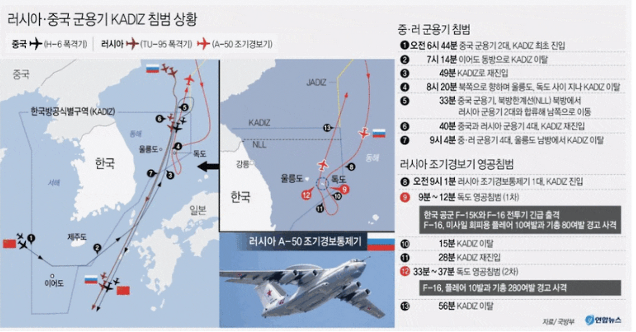특히 러시아 군용기 1대는 독도 영공을 두 차례 침범했고, 우리나라 공군 전투기가 경고 사격을 하며 대응할 정도의 위험한 상황이 벌어진 것이다. 우리나라가 세계 무대에서 얼마나 동네북이 되었는지, 그 날의 상황을 간략하게 요약해보도록 하겠다.
