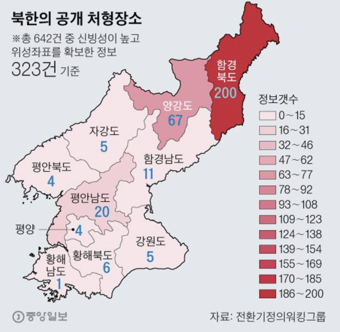 북한의 인권 문제는 어제오늘 일이 아니다. 최근 대북 인권 단체 '전환기정의워킹그룹'의 발표에 따르면, 북한의 공개 처형지는 323곳에 달한다. 공개 처형된 시체를 처리하는 장소는 25곳으로 확인됐고, 공개처형 장소에 인민학교(초등학교) 아이들이나 중고등학교 학생들이 참관하는 것이 탈북자들의 증언을 통해 알려졌다. 조사에 응한 84명의 탈북자들 중 공개처형을 목격한 비율은 83%에 달했으며, 최저 목격 나이는 7세에 불과했다.
