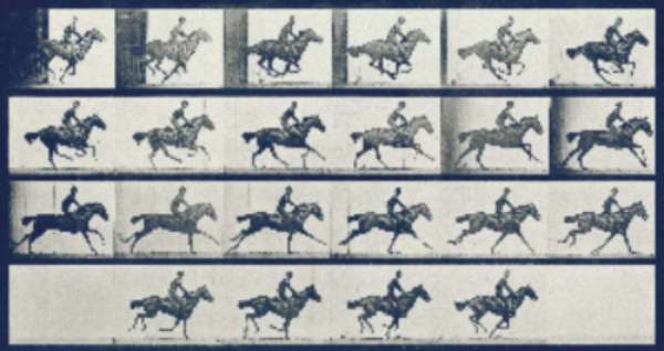 그가 1937년 6월 촬영한 <horse in motion> 사진이다. 사진은 말이 달리는 움직임을 연속적으로 보여주는 여러 장의 사진으로 구성되어 있다.