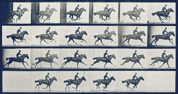 머이브리지는 1872년 이 제안을 받아들이긴 했지만 연사 기능이 없었던 때라 빠른 시간에 연속 촬영을 할 수 없었다. 무려 6년 동안 연속 촬영 기술을 연구한 그는 여러 대의 카메라를 일렬로 배치하고, 말이 달릴 때마다 카메라 셔터를 끊임없이 작동시키는 방법으로 촬영하기로 했다. 말이 레이스 트랙을 지나가면서 가느다란 와이어를 치면 자동 고속 셔터가 전시 신호에 의해 이미지를 기록되는 방식이었다.