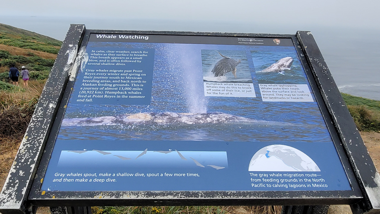 표지판에는 태평양의 먹이 지역에서부터 멕시코의 번식지까지의 회색 고래의 이주 경로가 지도로 표시되어 있다. 매년 겨울과 봄에 포인트 레예스를 지나 멕시코의 번식지로 이동한 후 다시 북쪽 알래스카의 먹이 지역으로 돌아오는데 무려 2만 킬로에 달하는 여정이다. "이 고래 같은 사람 같으니라고!: 이런 표현이 극찬이 되어야 하는 것이다.