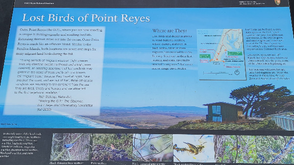 새를 관찰할 수 있는 포인트가 설명된 안내판이다. 등대 근처의 사이프러스 나무, 목장 서쪽의 사이프러스 숲과 기타 초목, Chimney Rock 지역의 덤불과 사이프러스 나무, Drakes Beach 근처의 사이프러스와 버드나무, 그리고 Drakes Beach 주차장 북쪽의 연못 등을 꼼꼼히 찾아 새를 따라 걷는 사람들의 모습을 볼 수 있다. 철새들의 이주 시기인 5월에서 6월, 그리고 8월에서 10월 사이가 가장 많은 사람들로 붐빈다.