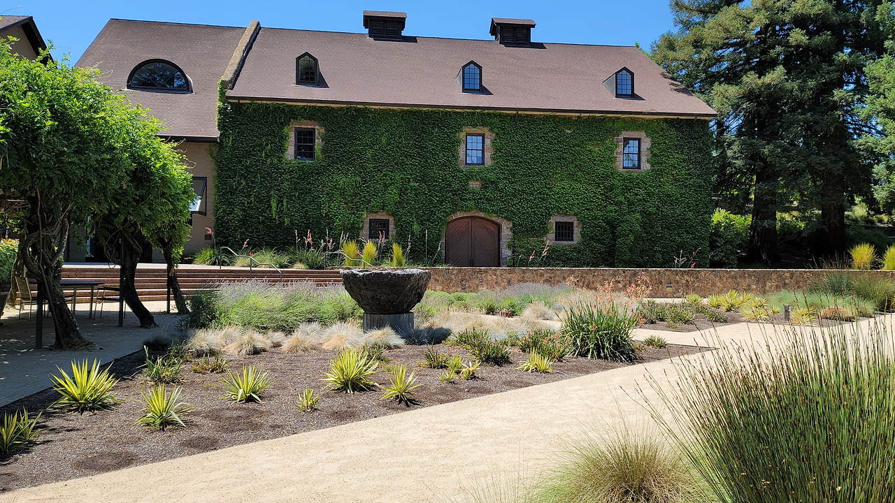 아름다운 정원과 포도밭, 도널드 헤스의 예술 작품 컬렉션으로 향하는 고풍스러운 건물. 우리를 기다리는 네 개의 와인 글라스.