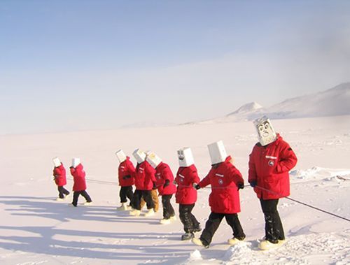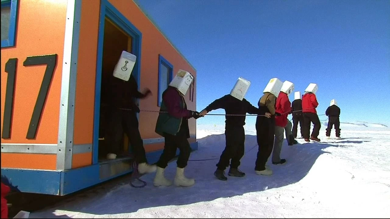 남극에서는 수시로 전혀 앞을 볼 수 없는 상황이 발생하는데, 눈보라가 심하고 춥고 피부 노출로 인한 동상 때문에 서있기 힘들게 되면 가시거리가 엉망이 되어. 온통 백색으로 보이는 현상에 대비하는 것. 정교하게 고안된 모의실험 장치는 다름 아닌 흰색 휴지통을 뒤집어 쓰는 것이다. 하얗고 안보이고 안 들리니 효과만점. 이동범위는 막사에서 출발해서 화장실 옆의 교관을 찾아 가는 것이지만 쉽지 않다. 특히 리더가 방향을 잘못 잡으면 모두 길을 잃게 된다. 교관은 멀리서 보고 있다가 길에서 벗어난 것을 알려주는데, 보이지 않는 이 짧은 길을 나란히 헤쳐나가기란 힘겹기만 하다.