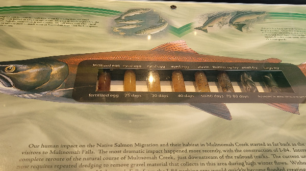 오늘의 점심 연어를 먹기 전에 관광 안내소에서 연어의 생애를 알 수 있는 안내판을 볼 수 있었다. 콜럼비아 강과 그 지류들은 북미에서 가장 중요한 연어 서식지 중 하나다. 연어는 이 강에서 성장하고 성숙한 후, 수천 킬로미터를 이동하여 태평양으로 나아간다.