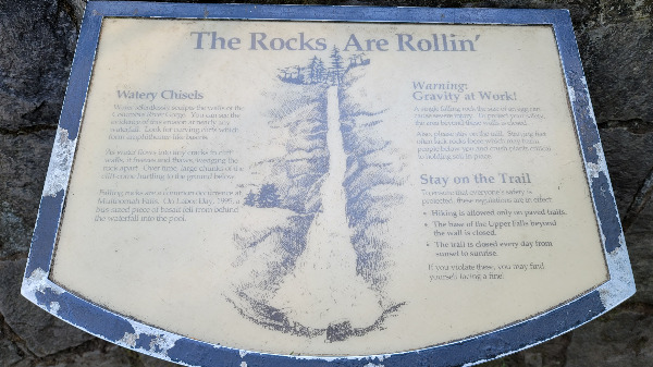 이 안내판은 멀트노마 폭포에서 발생하는 낙석 위험과 자연 형성 과정을 설명하고 있다. 물은 콜럼비아 강 협곡의 벽을 끊임없이 깎아내면서 협곡을 형성해 왔다. 폭포 주변의 곡선형 절벽은 물이 암벽을 깎아 만든 것으로, 천연 원형 극장과 같은 형태의 분지(amphitheater 암피씨어터) 구조를 이루고 있다.