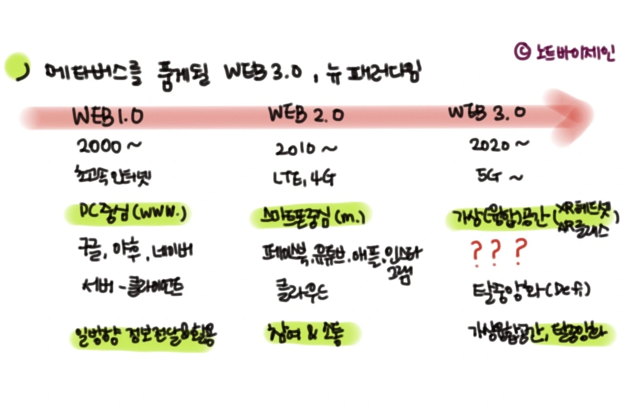 바야흐로 Web2.0에서 Web3.0의 세상으로 넘어가는 중이다. 더 빠른 인터넷, 초실감을 담아낼 수 있는 XR디바이스, 인공지능의 혁신적 발전, 데이터의 의미를 각 주체별로 지능화하고 물리적 편리함을 넘어 시공간을 초월해 생활하고자 하는 인간의 삶 추구 방향등이(사실 이 니즈는 2년 넘게 지속되고 있는 코로나 19 바이러스가 앞 당긴 사회 현상으로, 어떤 이유에서든 소통과 관계를 맺어야 하는 사회적 동물인 인간과 기업들이 갑자기 맞이한 모든 단절을 극복하려다 보니 생긴 디지털 압박에 의해 당겨진 변화!) 박자를 맞추어 새로운 환경으로 이동을 촉진 시키고 있다.