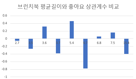 구글에 적정 글 길이를 검색했고,정리했다. 브런치북 대상 수상작의 평균 글 길이도 구했다. 왜냐하면 에세이 때처럼 통계분석했지만 인사이트를 찾기 힘들었다. 아래 그래프를 보면 일관성을 찾기 힘들다. 아무리 모수가 적다지만 모수를 조금 늘린다 해서 딱히 변할 건 없어 보였다.