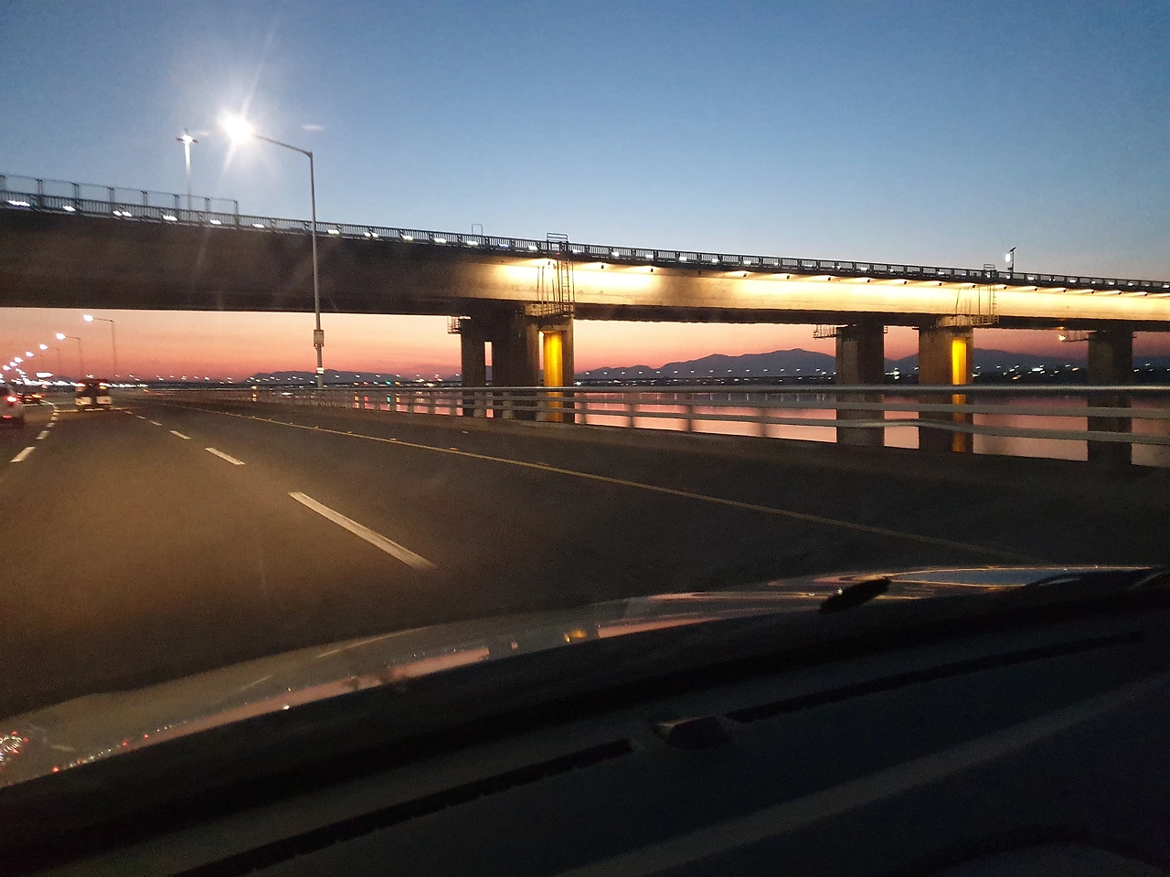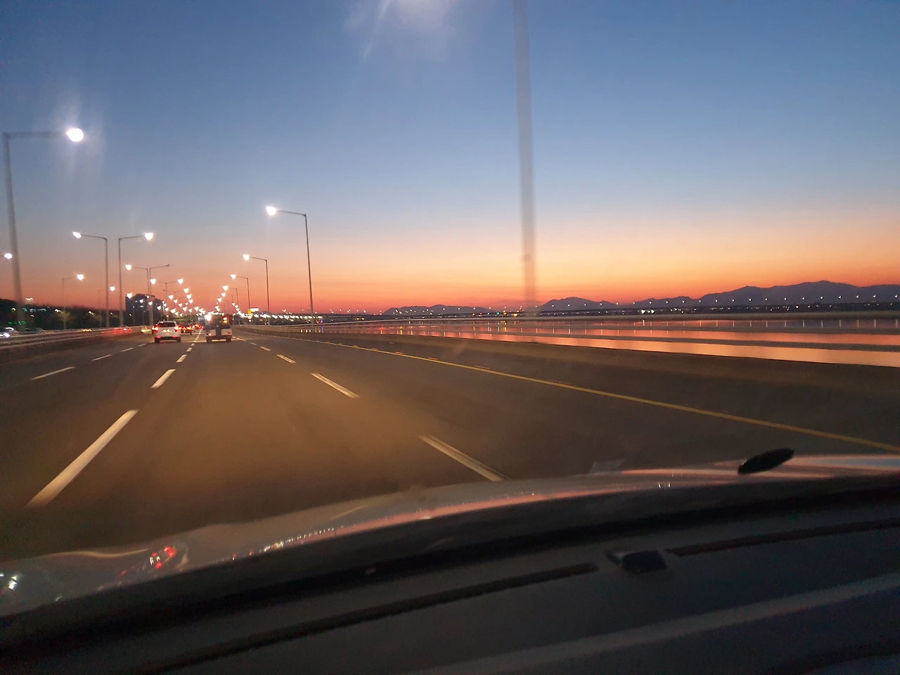 초저녁 바다에서 깨진 겨울해의 빛이 수평선에서 수변도로 곳곳에 닿는다.