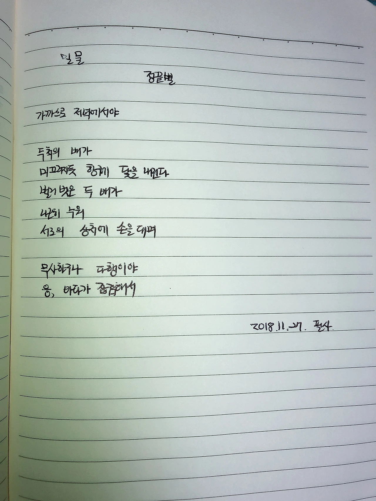 가까스로 저녁에서야두 척의 배가미끄러지듯 항구에 닻을 내린다벗은 두 배가나란히 누워서로의 상처에 손을 대며무사하구나 다행이야응, 바다가 잠잠해서