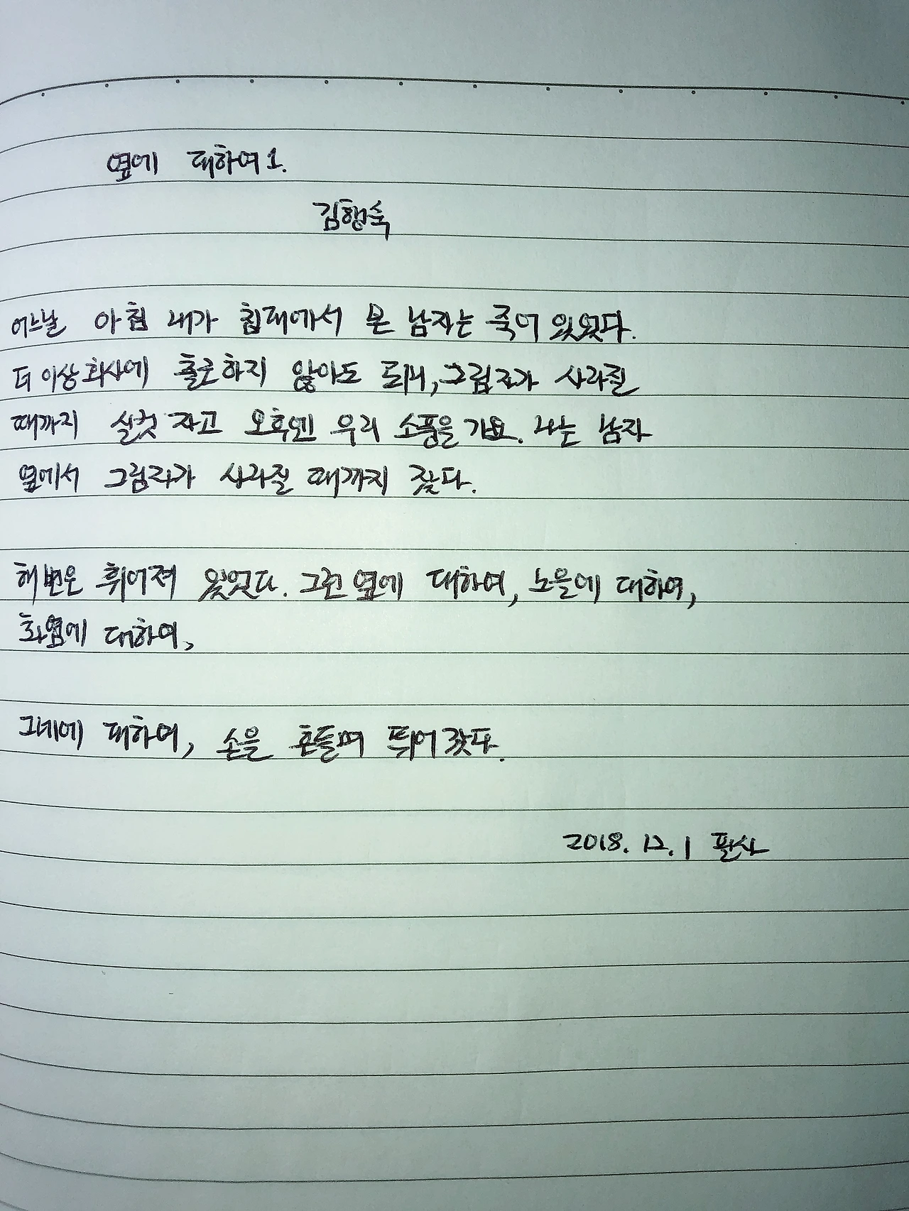 어느 날 아침 내가 침대에서 본 남자는 죽어 있었다. 더 이상 회사에 출근하지 않아도 되니, 그림자가 사라질 때까지 실컷 자고 오후엔 우리 소풍을 가요. 나는 남자 옆에서 그림자가 사라질 때까지 잤다.