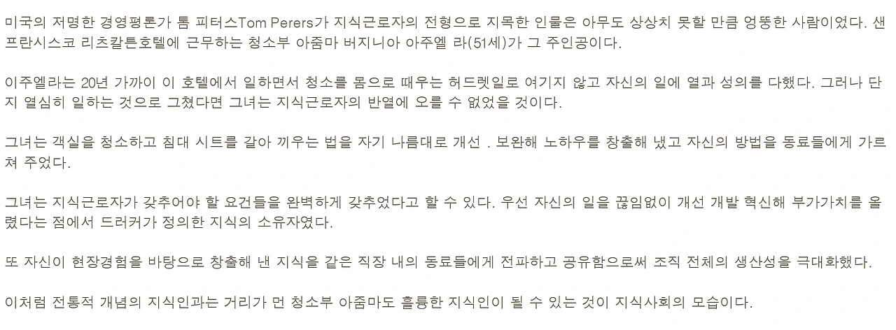 샌프란시스코 리츠칼튼 호텔에 근무하는 청소 아줌마가 지식근로자의 정형이라는 글도 어디선가 읽어봤다. (그 글은 아래 첨부한다.) 하지만 머리로 아는 것과 실제로 보는 것은 다른 법. 김 차장님을 옆에서 지켜보며 그동안 내가 일해온 업무 방식을 되돌아보며 신선한 충격을 받았다.