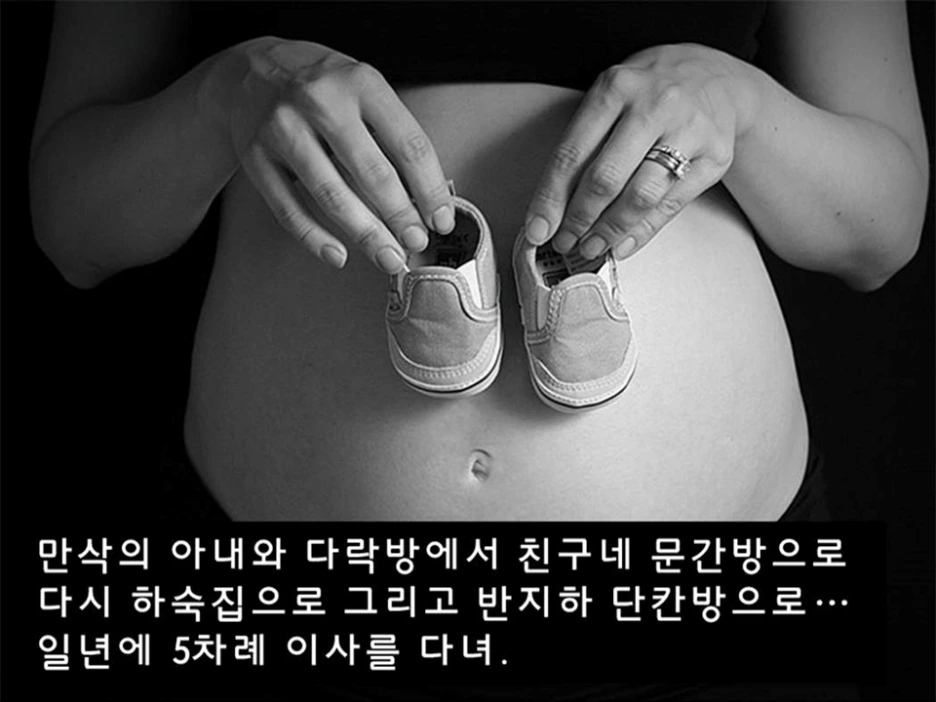 만삭의 아내와 다락방에서 친구네 문간방으로, 하숙집, 반지하 단칸방으로 일년에 이사만 5번.