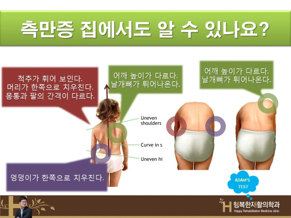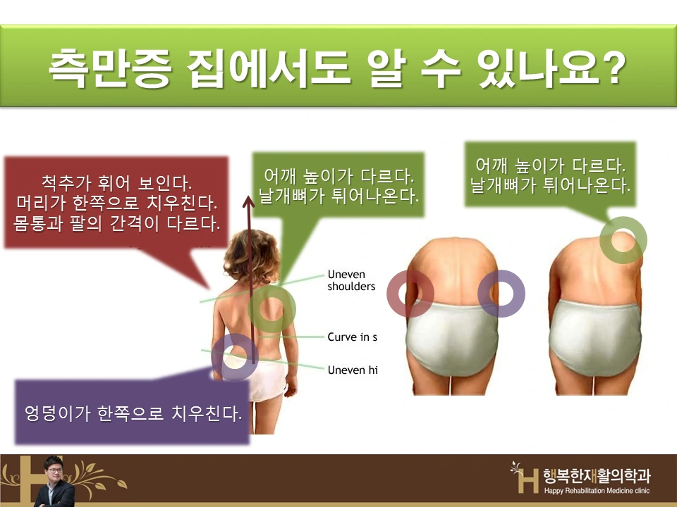 집에서 측만증을 확인하는 가장 확실한 방법은 차렷자세에서 두 손을 모으고 몸을 앞으로 최대한 숙였을 때 뒤에서 보면 날개뼈의 높이가 달라 보일 때 측만증을 강력히 의심할 수 있습니다.