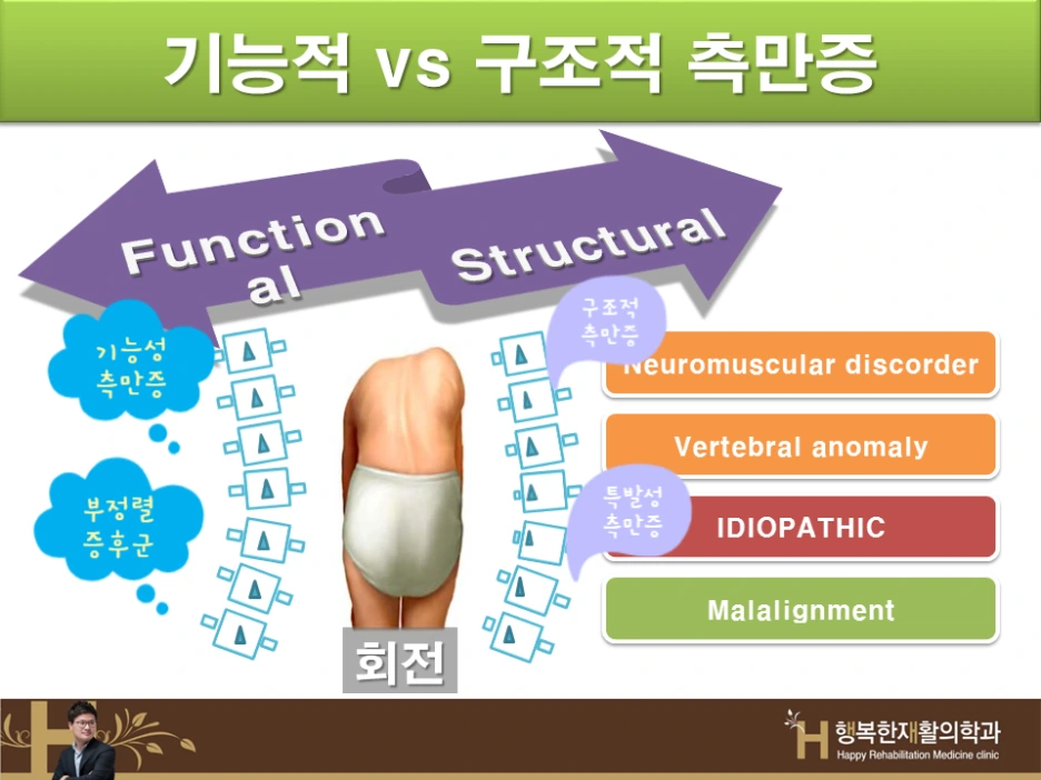 특발성 측만증과 비교되는 것이 부정렬증후군입니다. 이것은 골반의 비대칭, 발의 아치 문제, 턱관절의 문제 때문에 측만증이 발생하는 것입니다. 허리에 통증이 심할 때 척추가 휘어져 보이는 것은 기능성 측만증이라고 합니다. 기능성 측만증과 부정렬증후군은 척추의 회전이 별로 없는 반면에 구조적 측만증은 척추의 회전을 동반하는 경우가 많습니다. 척추자체가 변형이 있거나 뇌성마비와 같은 신경계 문제, 근육병과 같은 근육의 위측 등으로 척추의 구조 자체가 변하는 측만증을 구조적 측만증이라고 합니다. 특발성 측만증은 구조적 측만증의 80~90%정도의 비중을 차지하는 대표적인 구조적 측만증입니다.