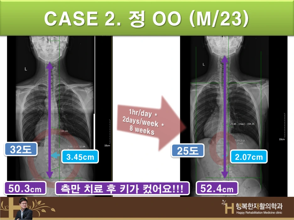 최근 저희 병원에서 치료한 분의 사례입니다. 20대 중반의 남자 환자 분이 4개월 전에 저희 병원에서 약 2개월간 측만증 치료를 하셨는데 상체가 2센티 이상 길어진 것을 확인할 수 있었습니다. 실제 성장치료에 있어서 가장 큰 위험요소가 측만증입니다. 급성장기에는 척추가 더 많이 휘기 때문에 주의하셔야 합니다..