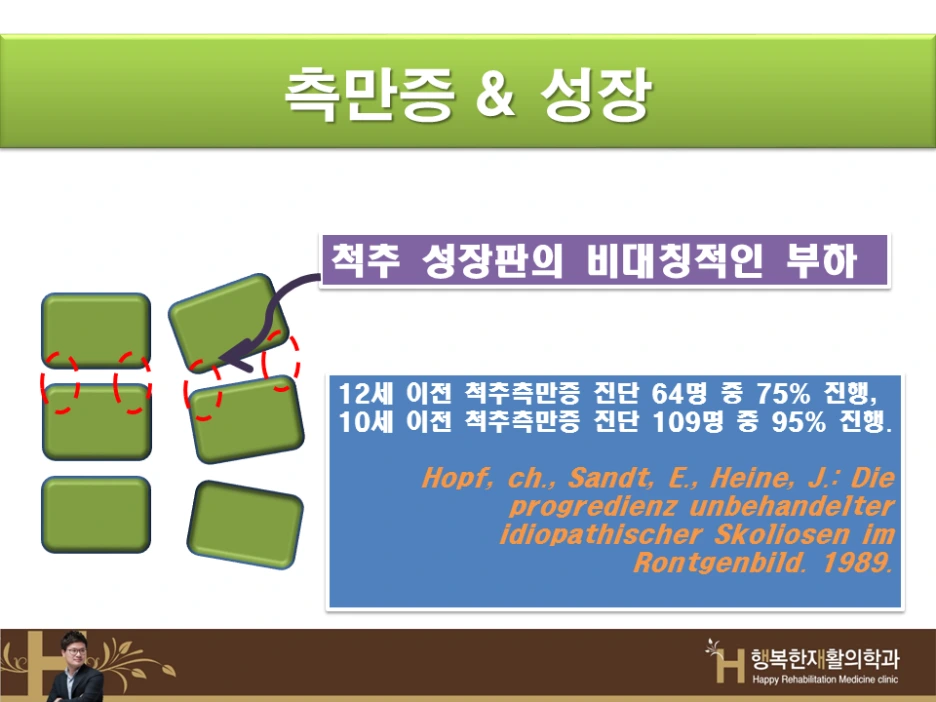 10세 이전에 측만증 진단을 받으면 95%가 더 각도가 나빠집니다. 12세 이전에 진단을 받으면 75%가 진행합니다. 그러니 한참 자라나는 시기에 척추측만증이 있다면 성장에 매우 치명적인 문제가 될 수 있습니다.