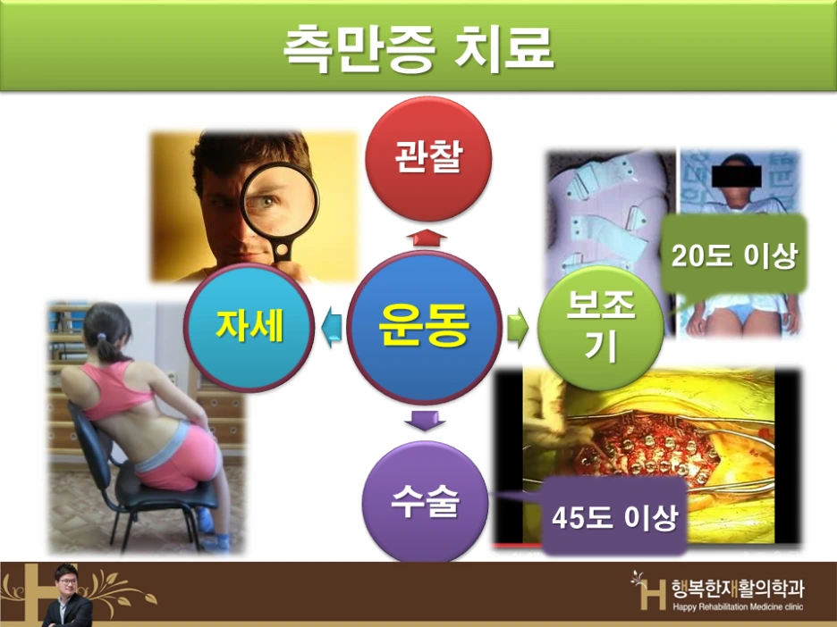 측만 각도가 50도가 넘으면 대체로 수술을 권합니다. 한참 크는 청소년기에 각도가 20도를 넘으면 보조기를 착용하여 진행을 막아야 합니다. 그리고 각도가 크고 작고 관계없이 측만증 교정 운동을 하면 예후가 좋아집니다. 측만증 진행을 늦추거나 측만각도를 개선할 수 있게 되죠.