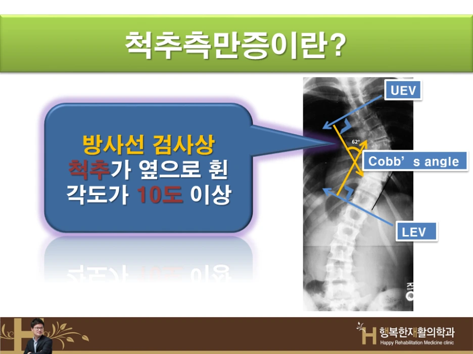 측만증은 척추의 모양이 앞이나 뒤에서 봤을 때 옆으로 휘어지는 병을 말합니다. 엑스레이로 검사 했을 때 옆으로 휜 각도가 10도 이상이면 측만증으로 진단합니다.