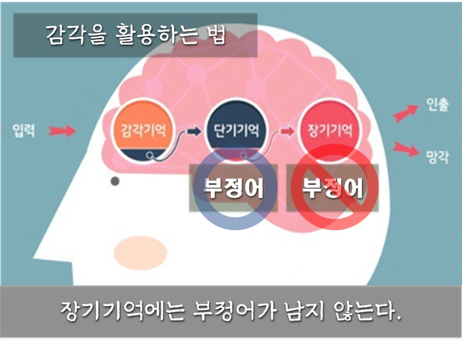 모든 기억은 감각을 통해 입력되고 뇌의 여러 부위에서 분산하여 저장됩니다. 최초의 기억은 단기기억인데 그 중에서 가치가 있다고 판단되는 것들은 장기기억으로 넘어갑니다. 단기기억에는 부정어가 효과가 있지만 장기기억에는 목적어가 이미지로 각인될 뿐 술어인 부정어가 남지 않습니다. 정보를 저장할 때 그 당시의 상황과 감정에 따라 각각의 사건을 점수를 매겨서 가중치가 높은 것을 저장합니다. 기억의 출력과정은 입력되었던 정보를 꺼내는 것인데 이 때도 역시 상황과 감정에 따라 다시 한 번 각색됩니다.
