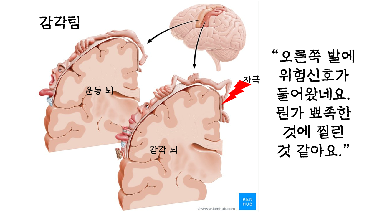 통증은 받아들인 감각신호가 생존에 위협이 되는 것인지 여부를 기억을 기반으로 감정을 일으킨 결과이다. 시상까지 도달한 감각신호가 뇌섬엽(insula)과 전대상회(ACC Anterior Cingulate Cortex)로 이어지면서 감정을 일으킨다. 순간적인 느낌은 뇌섬엽에서 바로 편도체(Amygdala)를 자극한다. 편도체를 자극하면 두려운 감정이 순간적으로 일어난다. 다른 감정보다 두려움은 즉각적으로 행동을 일으키는데 만일 생존에 위협이 되는 것이라면 즉시 피해야 하기 때문이다.