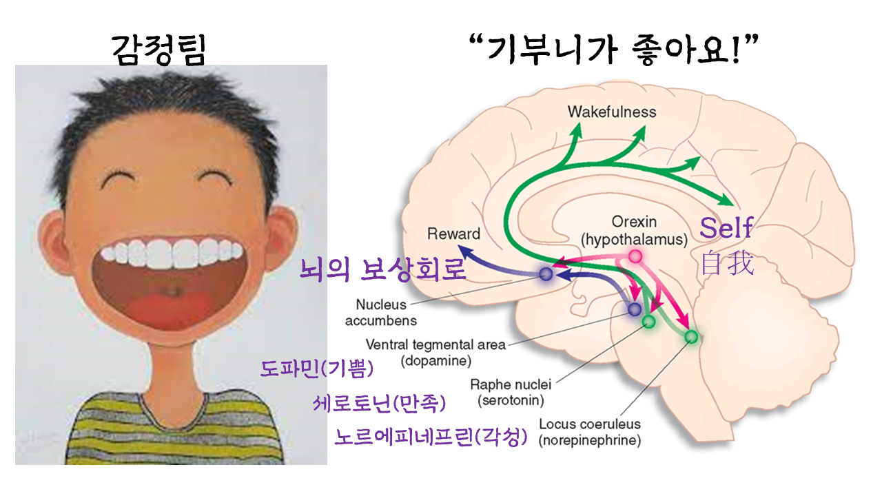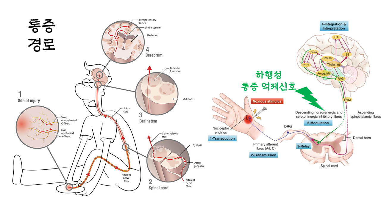 시상하부(Hypothalamus)는 자율신경과 우리 몸 전체를 조절하는 원초적 자아 self에 해당하는 부위이다. 시상하부는 감정과 기억을 참고하여 통증을 종합적으로 판단하여 아래로 신호를 보낸다. 뇌의 보상회로 중추인 측좌핵(Nucleus Accumbens)과 기저핵(Basal Ganglia)에서 기쁨과 몰입을 일으키는 도파민을 분비하고, 봉선핵(Raphe Nuclei)에서 만족과 평온한 느낌을 주는 세로토닌을, 청반(Locus coeruleus)에서는 의식적 각성을 일으키는 노르에피네프린 등의 신경전달물질을 분비한다. 중뇌수도관 주변의 중뇌수도회색질(PAG PeriAqueductal Gray), 연수 주변(Rostral Ventromedial Medulla)에서 오피오이드 계통의 천연 진통물질인 엔도르핀과 다이돌핀을 얼마나 분비할 것인지를 전전두엽(PreFrontal Cortex)이 결정한다.