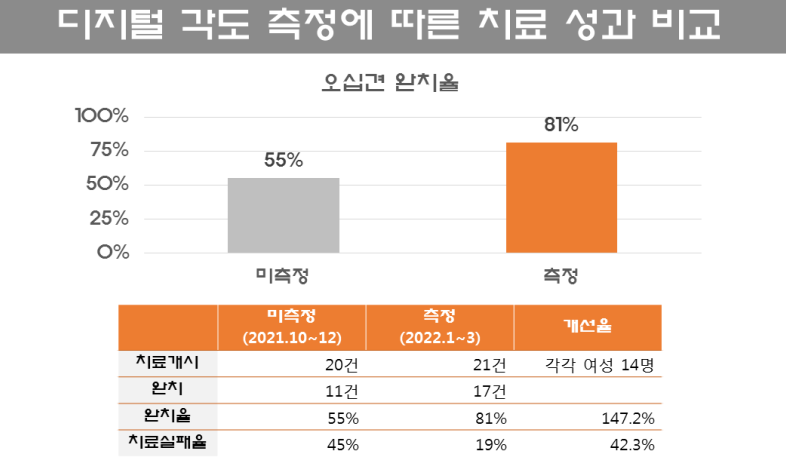 우리 병원도 디지털 관절 각도계를 사용하기 전에는 오십견 완치율이 55%에 그쳤다. 디지털 관절 각도계를 사용하면서 현재 호전도와 앞으로 치료계획을 환자와 의사가 공유하면서 오십견 완치율은 81%로 47% 이상 상승했다.