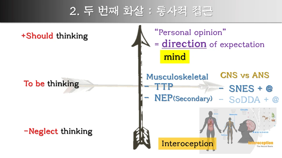 만성통증 환자라도 처음부터 통증기능분석적 접근에 입각하여 정확한 Physical Examination을 통해 통증의 위치와 양상, 통증 유발요인 등을 집요하게 확인해야 한다. 상당수의 만성통증 환자들은 통사의 기본 치료법인 TTP, NEP만으로도 호전을 보인다. 자율신경계 증상이 동반될 때 자율신경계치료 SNEPI를 추가하여 치료를 마무리하는 경우도 종종 있다.