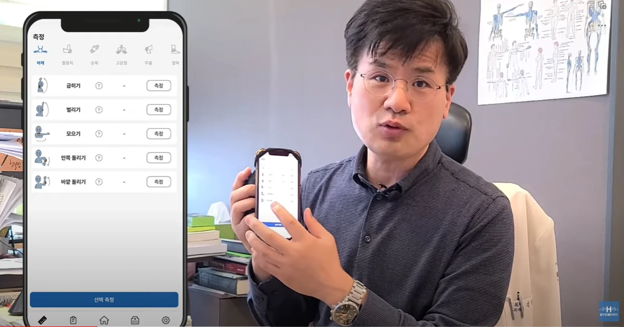 2. 오십견 환자라면 맨 아래 좌측의 측정 버튼을 눌러 굽히기와 벌리기만 측정해도 환자의 상태를 객관적으로 평가할 수 있다.