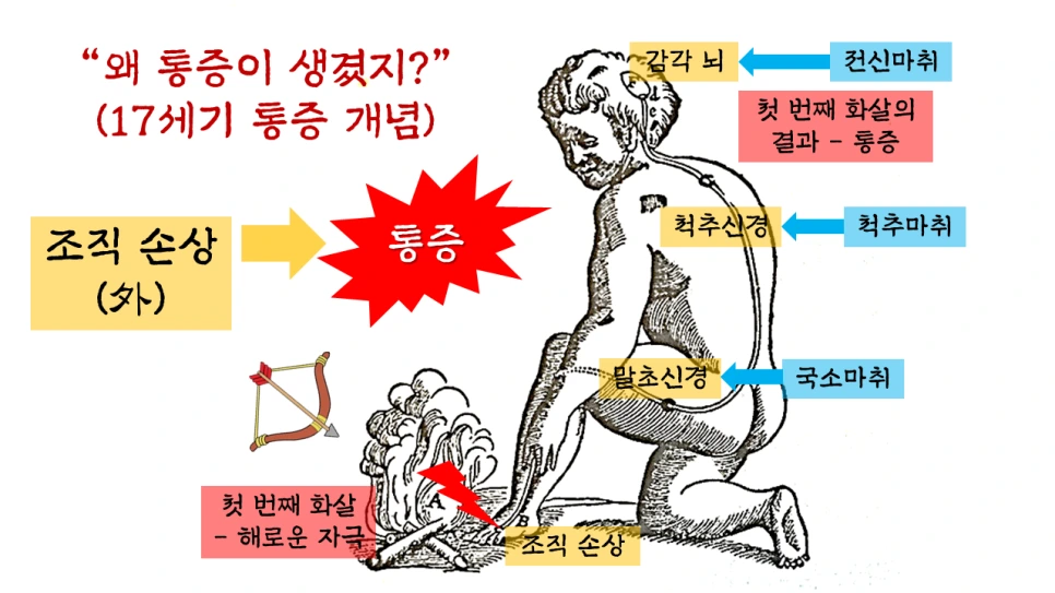 가) 고전적 통증 모델 : 데카르트의 심신이원론에 기반한 생물학적인 통증 모델