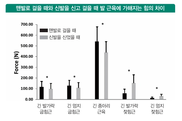그런데 엄지발가락을 포함해서 발가락과 발등을 위로 들어 올리는 근육은 신발을 신은 쪽에 더 많은 힘이 가해집니다.