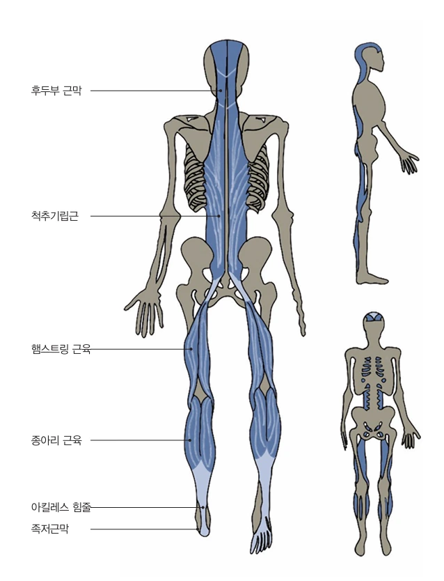 발뒤꿈치에서 발바닥을 지나 앞발까지 뻗은 족저근막은 발의 아치를 지탱하면서 발의 안정감과 걸거나 달릴 때 효율을 높여 줍니다. 좀 더 쉽게 빨리 달릴 수 있게 해주는 역할을 하는 셈입니다. 그런데 이 족저근막이 얇은 막으로 이어지면서 발뒤꿈치 뼈에서 아킬레스 힘줄과 연결되고 아킬레스 힘줄은 종아리 근육과, 종아리 근육은 허벅지 뒤쪽의 햄스트링 근육과 연결됩니다. 햄스트링 근육은 좌골에서 골반의 다양한 인대와 만나고 이것이 엉덩이의 다양한 둔근과 천골, 척추에 안정감을 주는 근육들과 차례차례 이어집니다. 이렇게 근육들이 그 기능에 따라 기차가 연결되듯 근막을 통해 연결되어 있습니다.