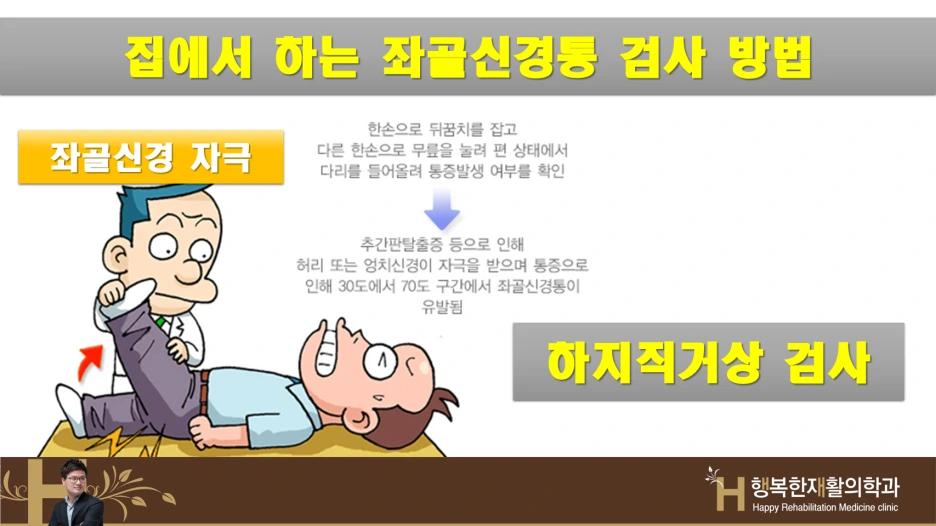 천장을 보고 바로 누운 상태에서 무릎을 펴고 다리를 쭉 뻗은 상태에서 발목을 위로 젖히고 다리를 들어 올려 봅니다. 바닥에서 다리가 약 30도에서 70도 올라온 구간에서 허리나 골반 다리 뒤쪽으로 쩌릿하게 전기가 오는 듯한 통증이 있다면 좌골신경통을 의심해 볼 수 있습니다. 물론, 이때도 잘 쉬면서 재활을 한다면 95% 이상 수술 없이 잘 회복합니다. 그러나 다리에 힘이 없는 상황이라면 수술이 필요할 수도 있습니다.