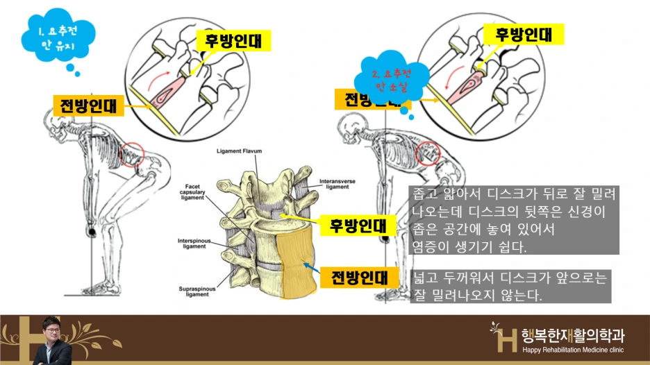이것은 허리디스크를 보호하고 있는 인대가 앞쪽은 두껍고 넓은데 비해 뒤쪽은 얇고 좁기 때문에 허리를 숙이면 디스크가 뒤로 밀려나기 쉽기 때문입니다.