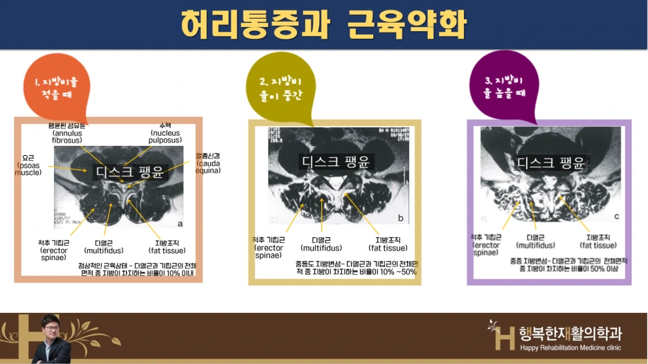 맨 우측의 3번 MRI 사진의 주인공은 평소에도 허리를 바로 펴기가 어렵습니다. 코어근육뿐 아니라 척추를 세워주는 기립근이 거의 지방으로 가득 차 있기 때문입니다. 척추 옆쪽의 요근도 동그란 제 모양을 유지하지 못하고 풀어져 보입니다. 이런 분들은 거의 요통을 달고 사신다고 보면 됩니다.