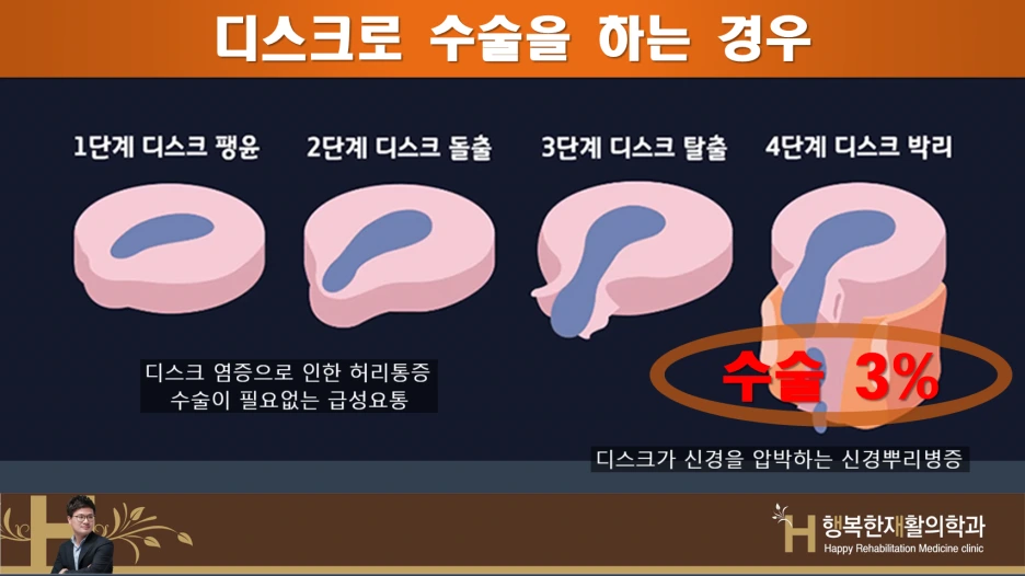 디스크가 직접적으로 신경을 압박하는 것이 아니라 염증만 있는 경우라면 수술을 할 필요가 없으며 초기에 잘 관리만 하면 큰 후유증 없이 잘 회복할 수 있습니다. 반면 신경을 직접 압박하는 경우에는 약 3~5%의 비율로 수술이 필요한 경우도 있기 때문입니다.