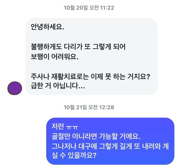 지난 번에는 한 달 이상 대구에서 치료를 하면서 겨우 어느 정도 회복되었는데 이번에야 말로 내려오시면 완전히 회복시켜 보내고 싶었다. 그런데 회사를 다니는 분인데 회사에서 이렇게 긴 휴가를 또 얻을 수 있을지 의문이었다.