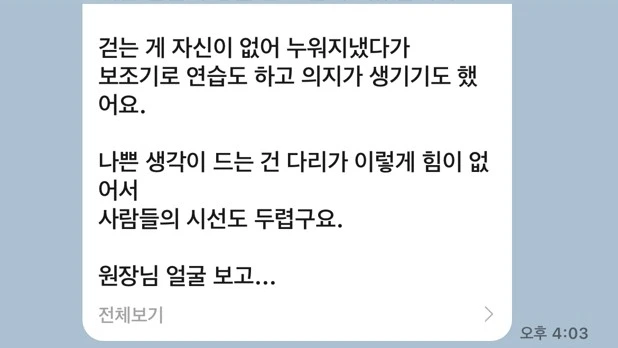 걷는 게 자신이 없어 누워지냈다가 보조기로 연습도 하고 의지가 생기기도 했어요.