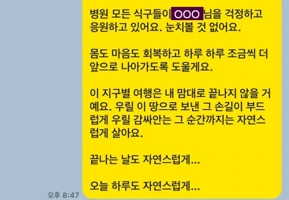 병원 모든 식구들이 OOO님을 걱정하고 응원하고 있어요.