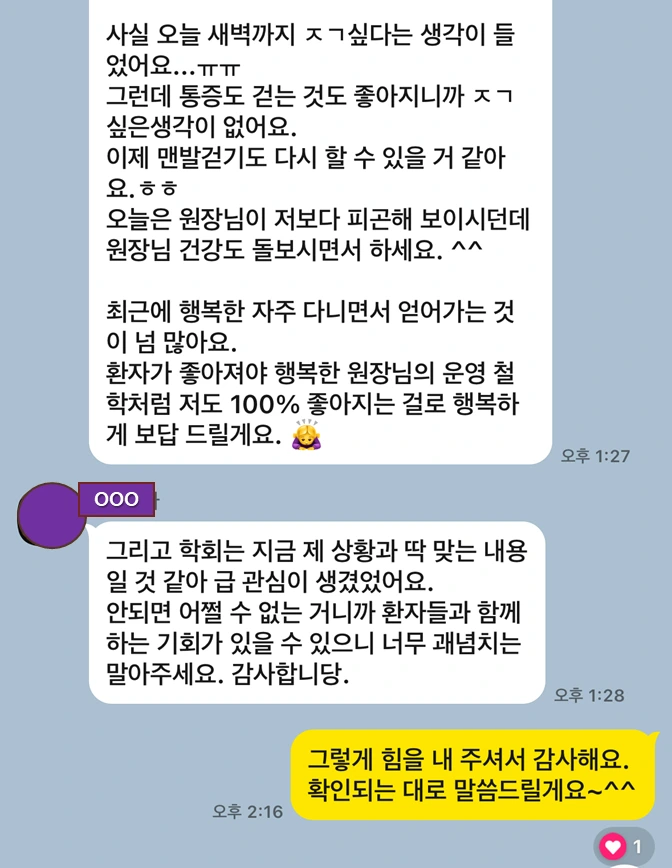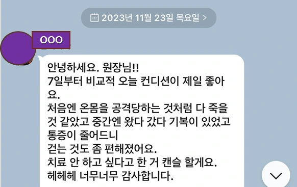 환자가 좋아져야 행복하다는 원장님의 운영 철학처럼 저도 100% 좋아지는 걸로 행복하게 보답 드릴게요.