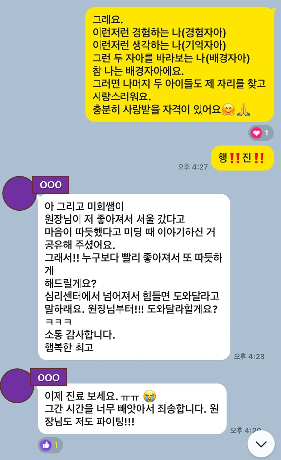 그리고 미회 쌤이 원장님이 저 좋아져서 서울 갔다고 마음이 따뜻했다고 미팅 때 이야기하신 거 공유해 주셨어요.