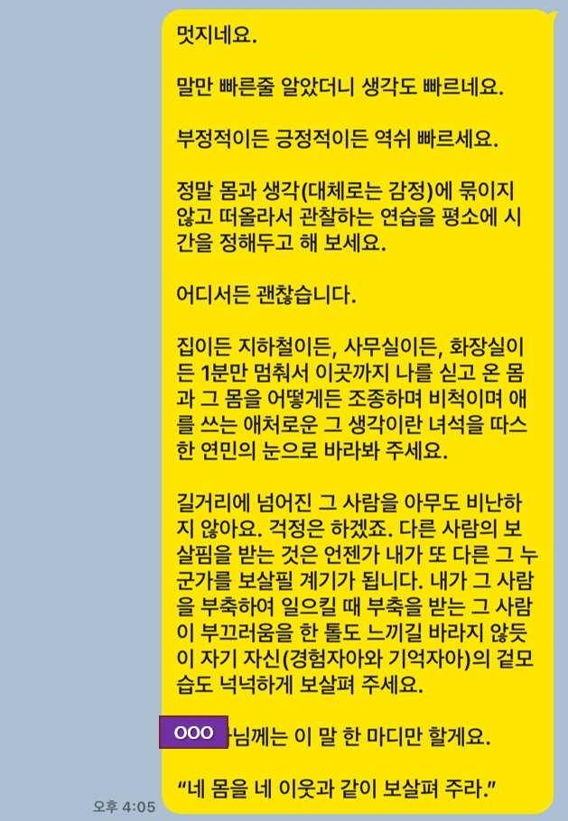 집이든 지하철이든 사무실이든 화장실이든 1분만 멈춰서 이곳까지 나를 싣고 온 ‘몸’에 대해 감사를 전하세요. 그 몸을 어떻게든 비척이며 조정하려고 애쓰는 애처로운 그 ‘생각’이라는 녀석을 따스한 연민의 눈으로 바라봐 주세요.